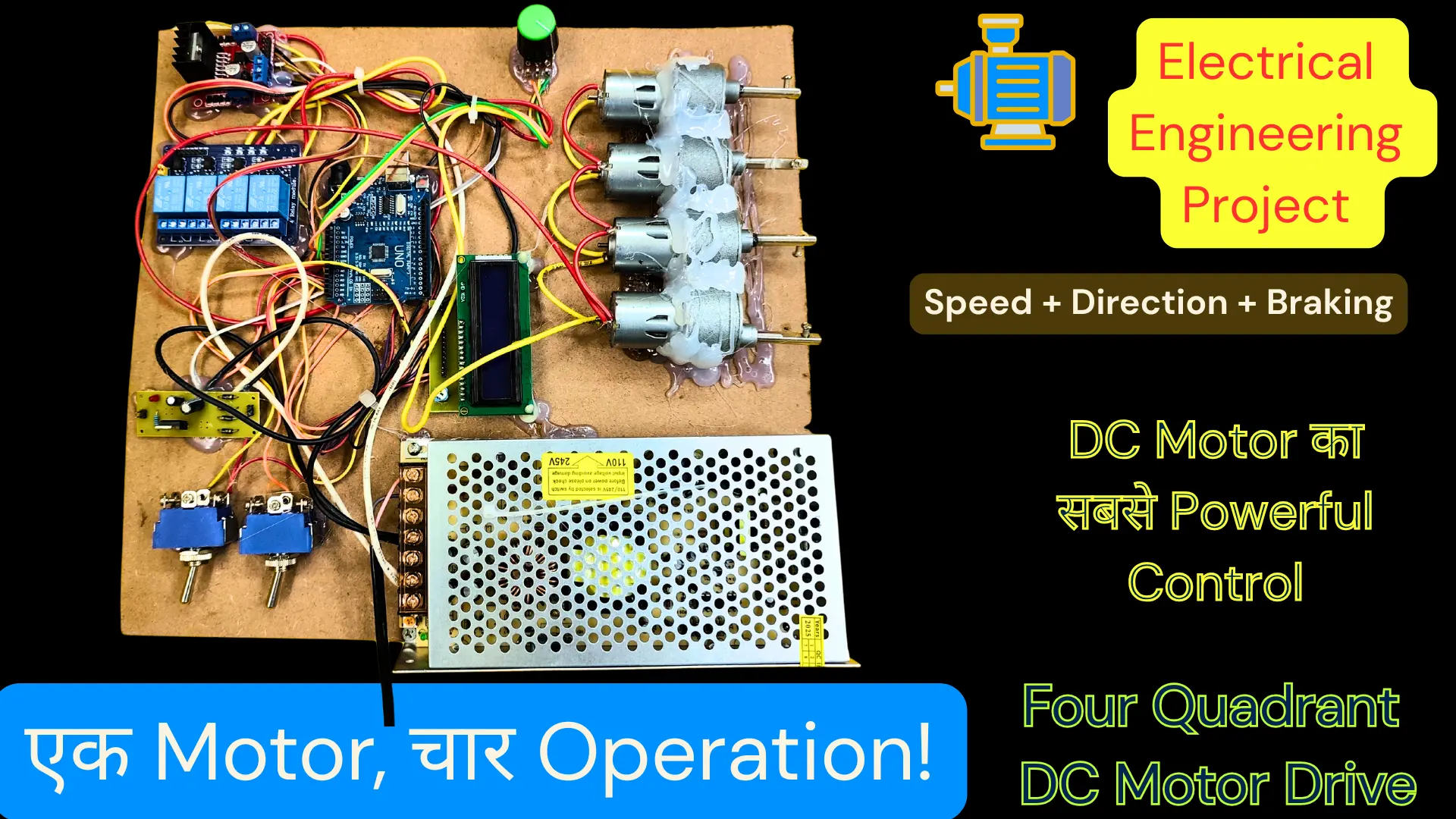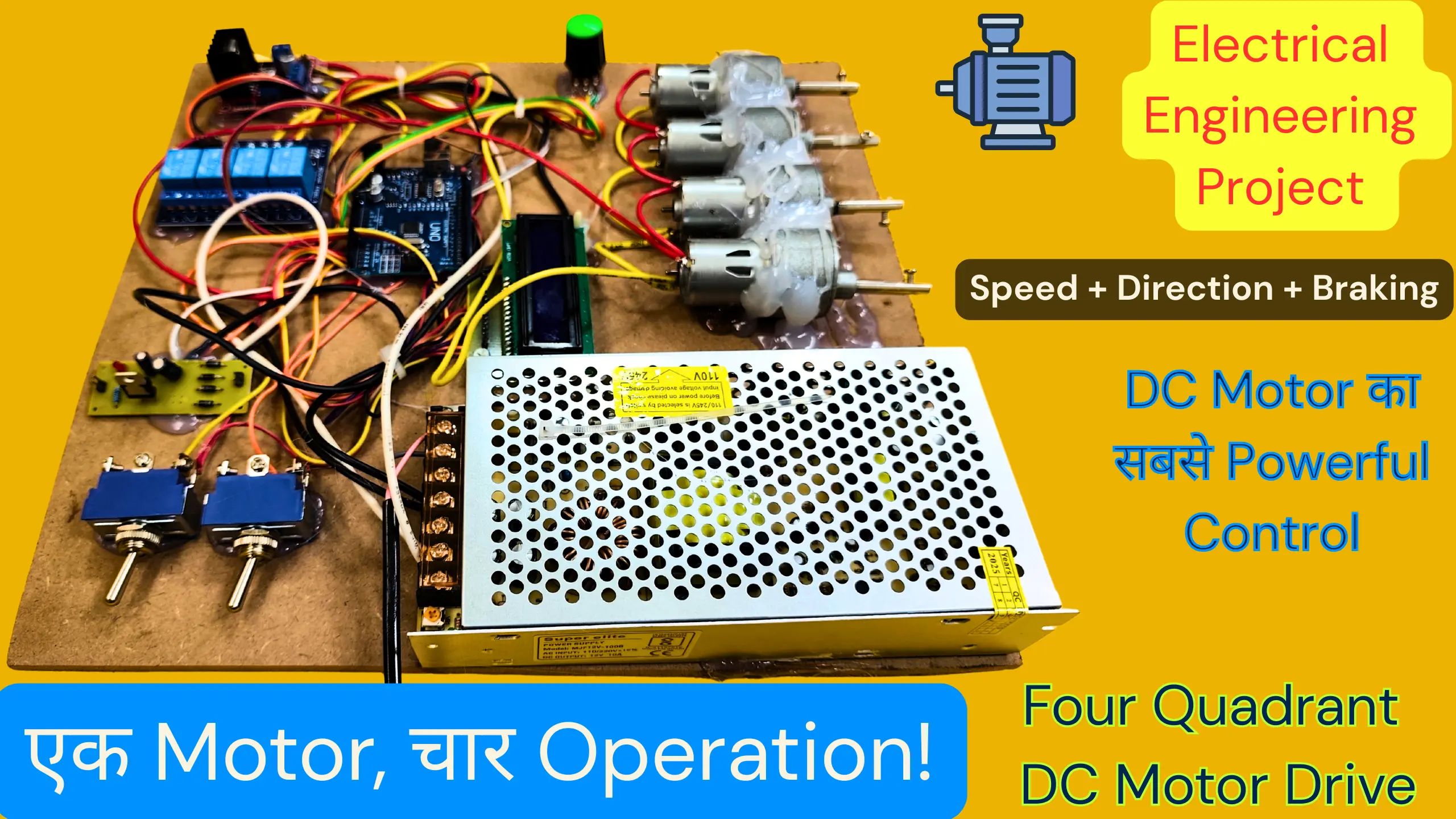 In this project, a heavy DC motor is controlled in all four operating quadrants – forward motoring, forward braking, reverse motoring, and reverse braking. The speed of the motor is varied smoothly using a potentiometer, while directional and braking control is achieved using relays and a motor driver arrangement. The system is designed to be robust, safe, and easy to demonstrate during project evaluations.